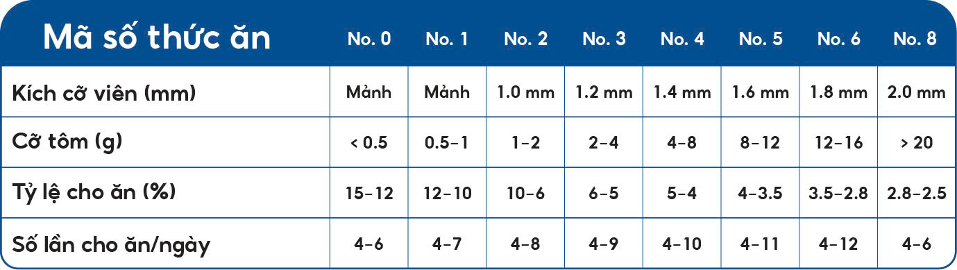 Nhiệt độ thích hợp từ 25°C – 30°C. Tùy chỉnh theo lượng ăn hàng ngày của tôm tùy điều kiện từng ao, từng trại nuôi.