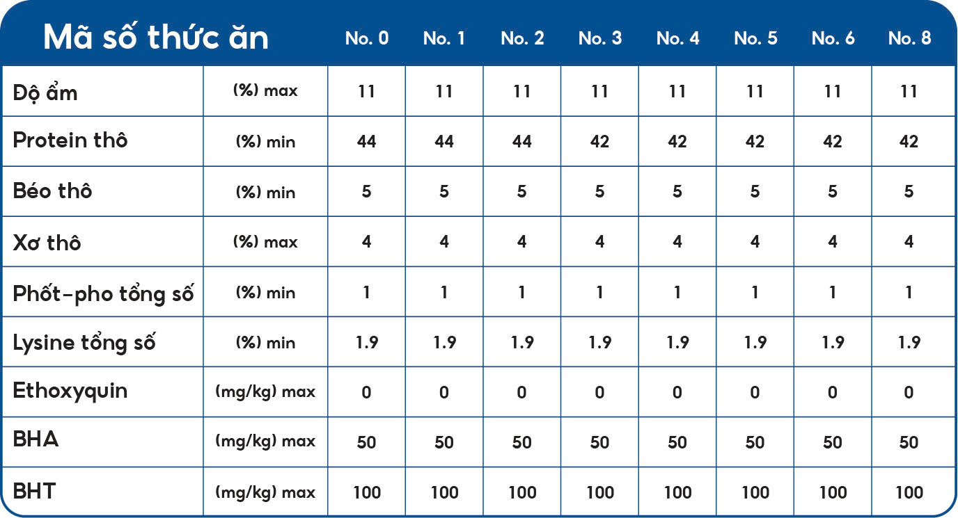 Bột và chất béo gốc sinh vật biển, bột và chất béo gốc thực vật, các Vitamin và khoáng chất, các phụ gia dinh dưỡng và phụ gia chức năng.