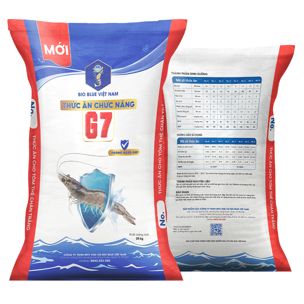 G7 là dòng thức ăn hỗ trợ tiêu hóa, giúp tôm hấp thu tốt dinh dưỡng, phát triển đồng đều, giảm hao hụt và phòng ngừa bệnh EHP ngay từ đầu.
