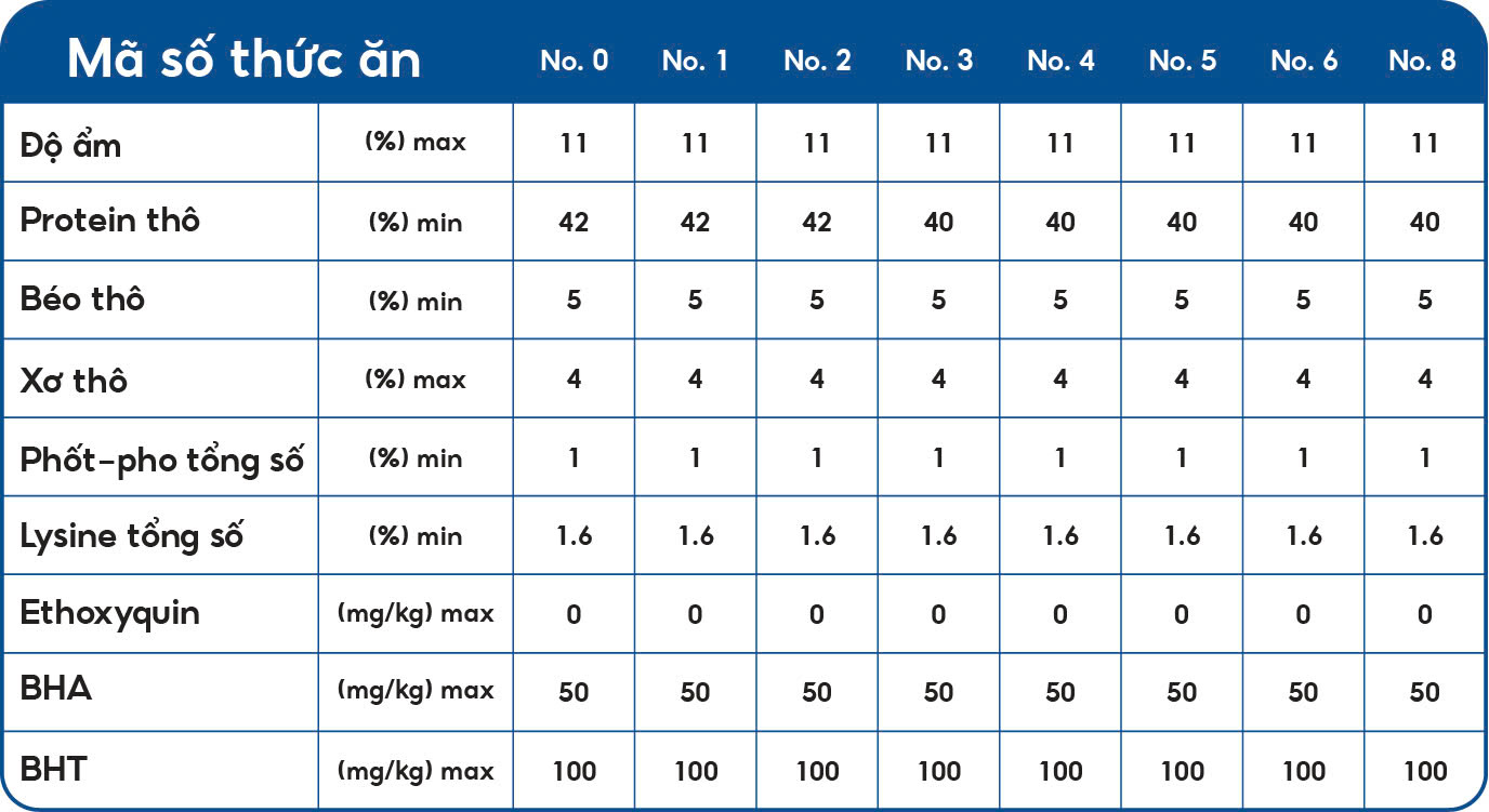 Bột và chất béo gốc sinh vật biển, bột và chất béo gốc thực vật, các Vitamin và khoáng chất, các phụ gia dinh dưỡng và phụ gia chức năng.